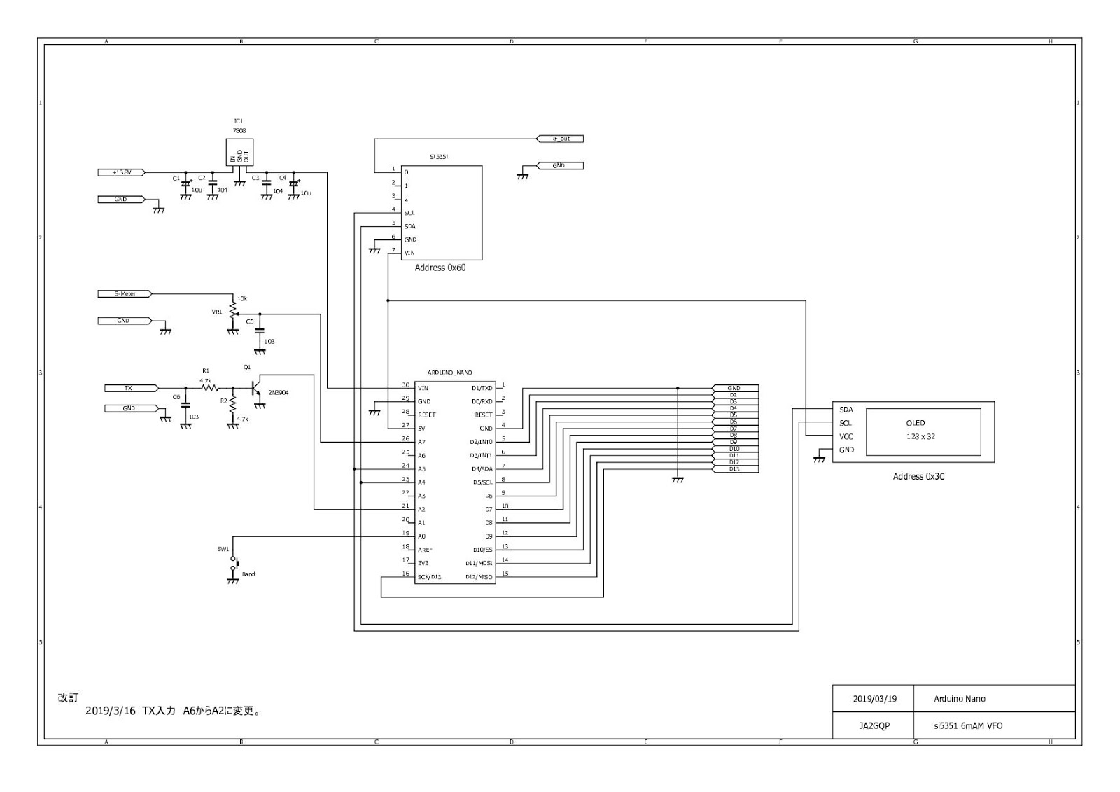 dsPICとMAX2452を組合わせたAFPSN用のVFOである。MAX2452のローカル発振は、目的周波数の2倍が必要な為、送信用VFOとした。設計に当たり、拡張性のあるH/Wを目指す事にし、I2Cを多用した。今迄のsi5351VFOは、カスタムライブラリを使っていたが、今回はgithubのものを使っている。